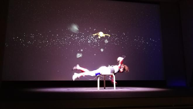 A performer controls in real time (thanks to the use of sensors) the movements of the animated character protagonist of the show. The 3D virtual world in which the narration is articulated was built with TouchDesigner, receiving signals from motion sensors through the OSC network protocol. Using the same protocol, a tablet is used for controlling the 3D scene in real time (camera, lights, scene change, events, audio triggers, etc.) and a second computer for the music and audio management (with Ableton Live and the use of its API through Max4Live).
