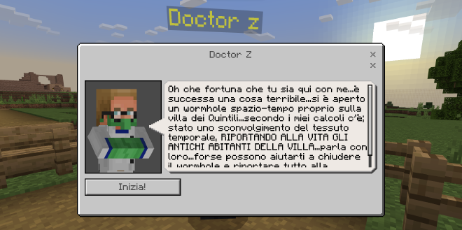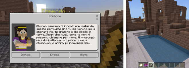 Villa dei Quintili Adventure is a videogame for children developed by using Minecraft tools and features. The story of the game takes place inside Villa dei Quintili, a huge archeological site of a roman villa where the player will meet key figures linked to the story of the villa, (the emperor Commodus, the gladiator Narcissus and more). The videogame features the reconstruction of the whole archeological area styled accordingly to Minecraft block design. The adventure game design is the result of the delicate balance between entertainment and learning.
